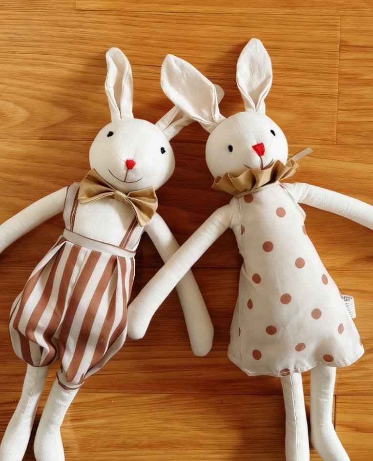 These fabric dolls are quite charming! You can see bunny dolls in adorable outfits and giraffe dolls with playful designs. They look soft and handmade, bringing a cozy and whimsical vibe, ideal for adding a lovely touch to any place.