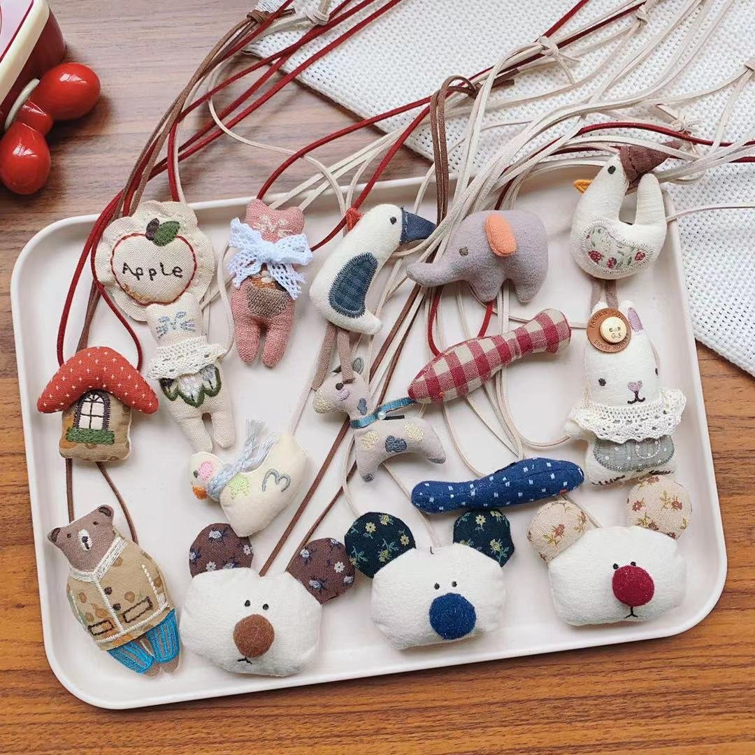 These fabric doll pendants are like a mini cute world! There are apple-themed dolls, lovely cats, birds, elephants, and more, each with unique designs and vivid details. They hang on different cords, looking so charming and playful, perfect for adding a touch of cuteness to your life.