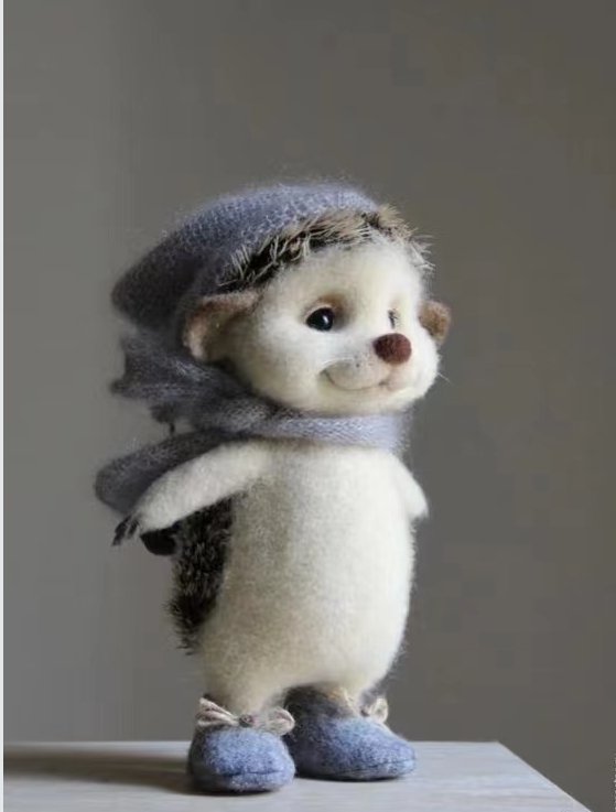 Meet this impossibly cute felt hedgehog buddy! All bundled up in a fuzzy gray hat, a cozy scarf, and tiny little boots—like it’s ready for a chilly day adventure. Its soft, fluffy body and sweet little face make it feel like the warmest, snuggliest friend ever. Perfect for sitting on a shelf and spreading all the cozy, whimsical vibes!