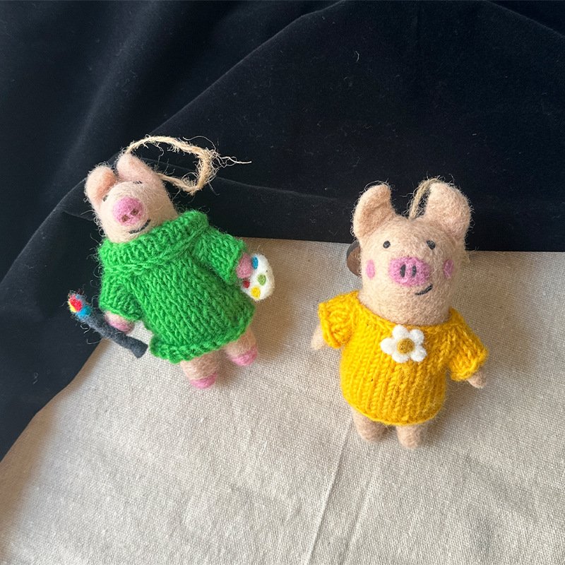 These are adorable felt pig ornaments! Handmade with soft felt and knitted details, they feature cute pigs in cozy sweaters—some in bright green with paint palettes & brushes, others in sunny yellow with a daisy accent. Each has a jute string for hanging, perfect for adding whimsical, crafty charm to your decor or as sweet gifts for animal lovers!