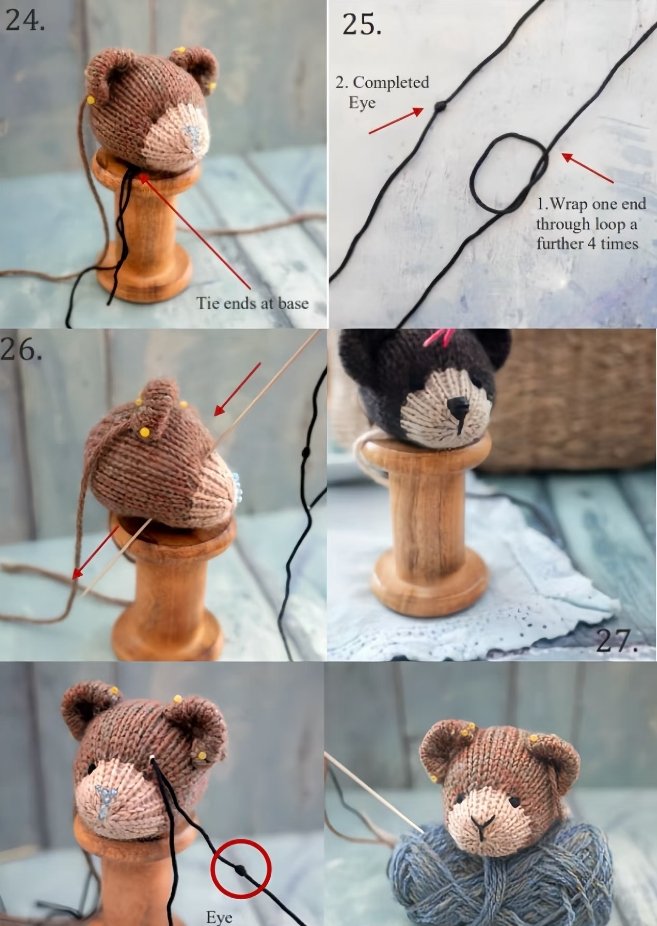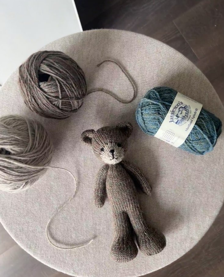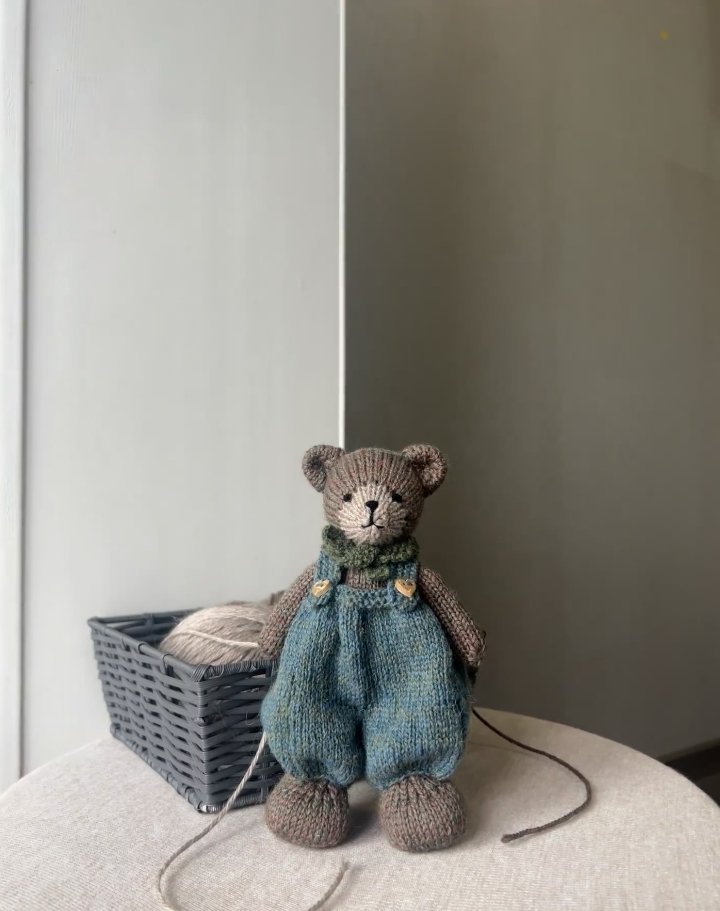 This knitted teddy bear doll is super cute! It has a cozy look with a green scarf and blue overalls, full of handmade charm. A lovely little companion that’s absolutely adorable!