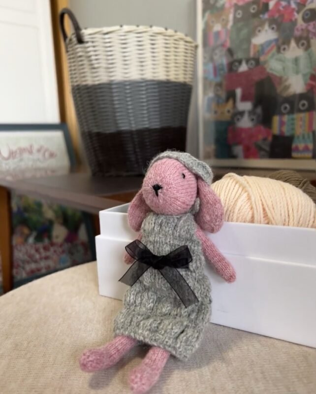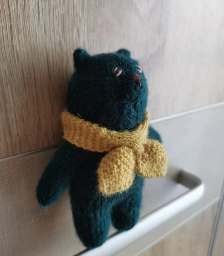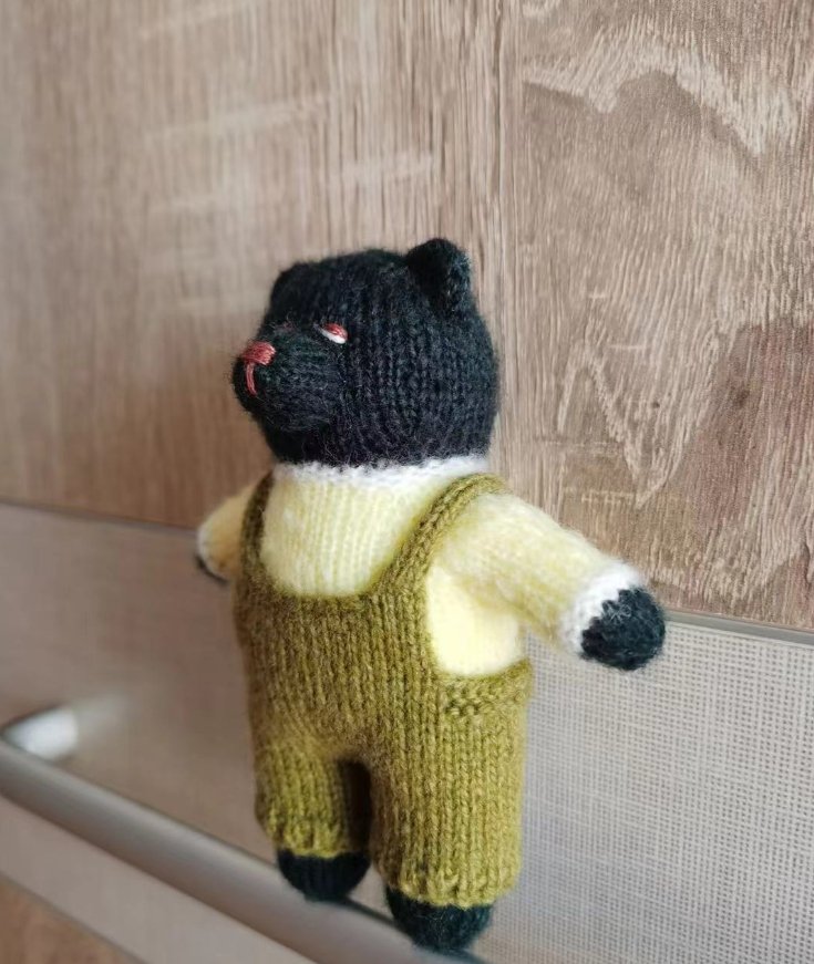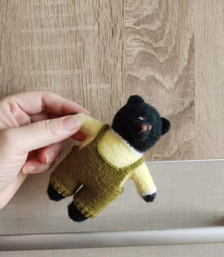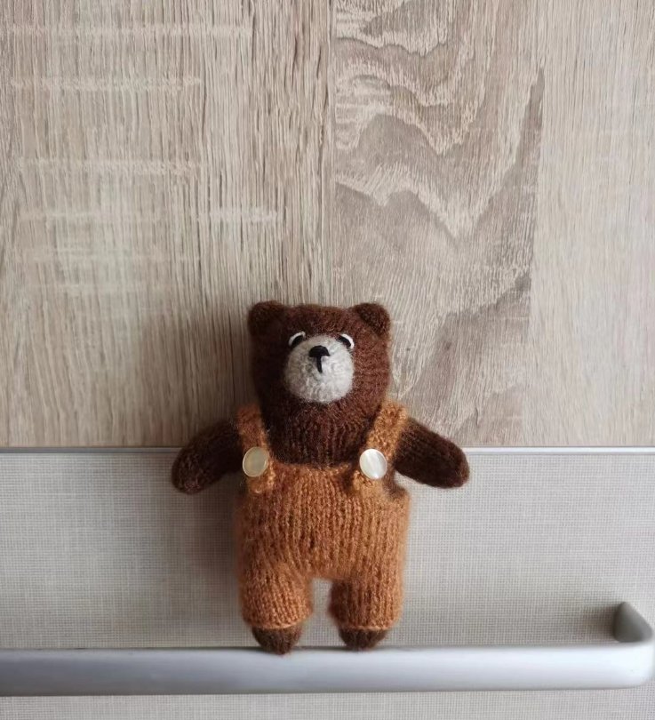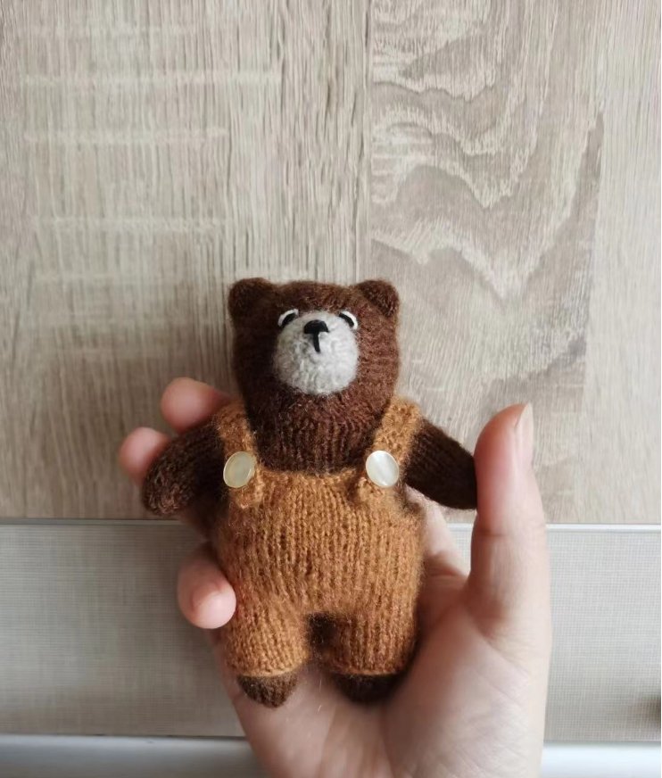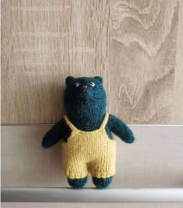 These are adorable hand – knitted bear dolls made with knitting needles. There are different styles: one is a teal bear that can be dressed with a yellow scarf or yellow overalls, and the other is a brown bear in brown overalls with buttons. They feature exquisite craftsmanship and cute designs, making them perfect as decorative items or lovely gifts for bear lovers and handmade craft enthusiasts.