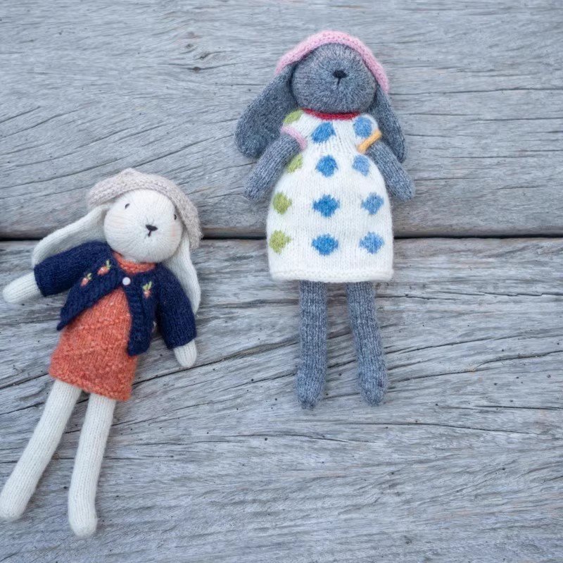 Look at these four super cute hand-knitted bunnies! They’re like a stylish squad, each rocking unique outfits—one in a purple polka-dot set, one in a cozy fair-isle sweater, one in a polka-dot dress, and one in a chic orange dress with a blue cardigan. Handmade with love, every stitch makes them full of charm and ready for a fun fashion show!