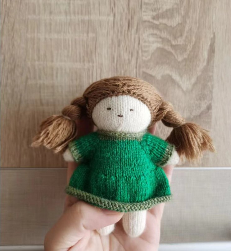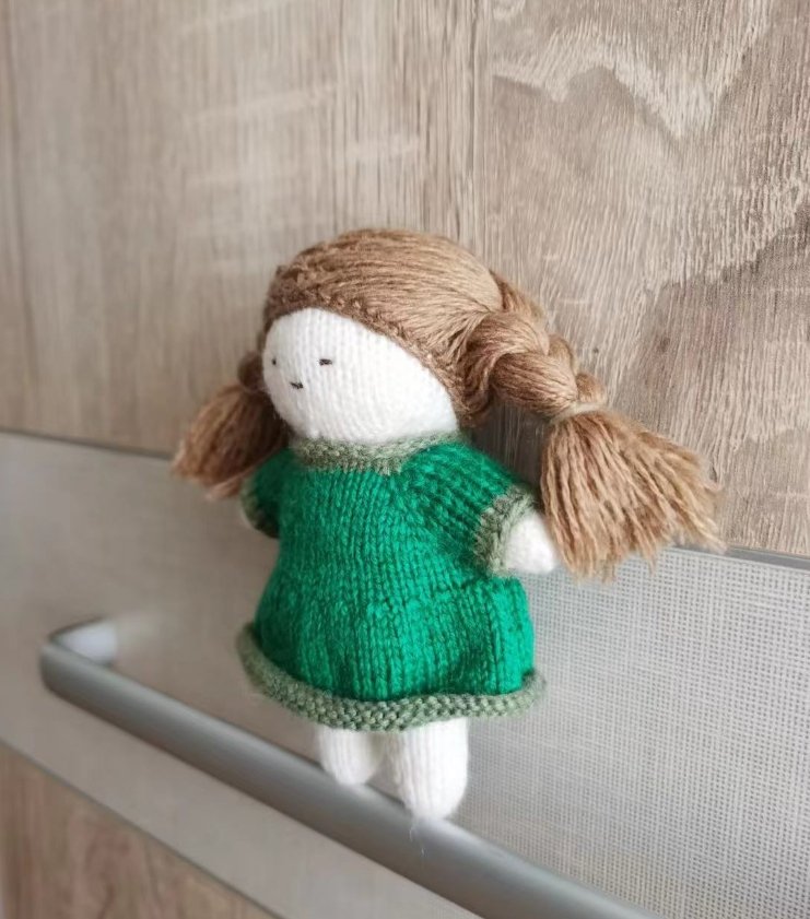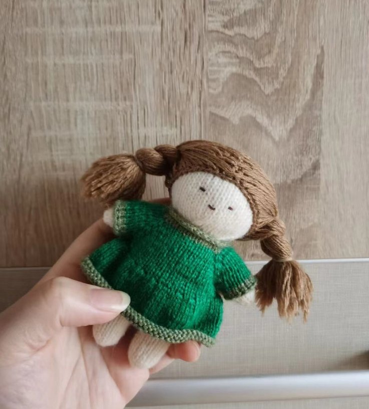 This is a charming hand knitted doll with brown hair made with knitting needles. It features a girl with brown braided pigtails, wearing a green knitted dress with detailed patterns and green trims. With its delicate craftsmanship and cute appearance, it’s an ideal decorative piece or a sweet gift for lovers of handmade toys.
