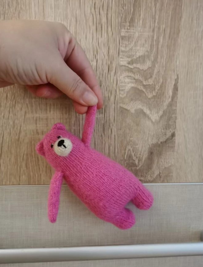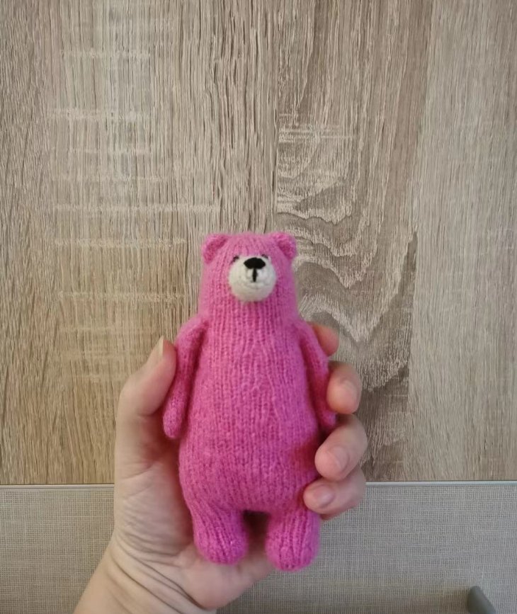 This is an adorable hand – knitted bear doll made with knitting needles. It features a bright pink body, a cream – colored muzzle, and a black nose, with exquisite craftsmanship. Its cute and vivid appearance makes it a perfect decorative item or a sweet gift for bear lovers and handmade craft enthusiasts.